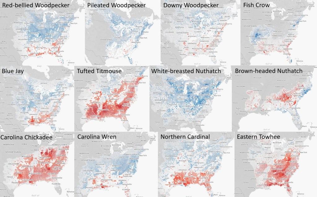 A few observations. For many species, they are declining where they are still common (the red dots are large), and increasing where they are less common or even rare (the blue dots are small). This probably implies that their overall population is declining. It also suggests that climate change may be hurting them in the south faster than it is helping them in the north. It takes time to establish new populations, and/or the new regions may not be as suitable as their old home. Note also that each of these species have different transition isoclines (if that’s what one would call it). For example, Red-bellied Woodpecker and Carolina Wren are increasing in Tennessee, but Tufted Titmouse are declining there.