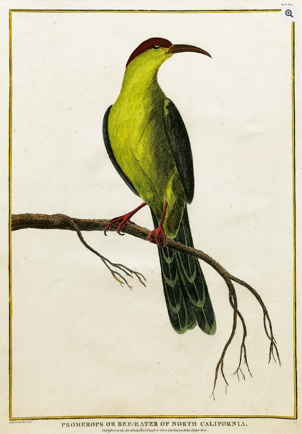 There are three bird illustrations: one is a pair of California Quail, another is likely a Varied Thrush from Alaska, and the third is this one, identified as a “promerops” or bee-eater. Later publications attempt to identify it correctly, usually as a thrasher (both California and brown!). To me, it is clearly a Yellow-billed Cuckoo. The unique undertail pattern, the bill shape, and the head pattern all match well, and really match no other species. The way it is perched upright in a tree is better for cuckoo than thrasher. I can find no publication that identifies it as a cuckoo. (Nor can I find one that identifies the “Black Bird” below either.)