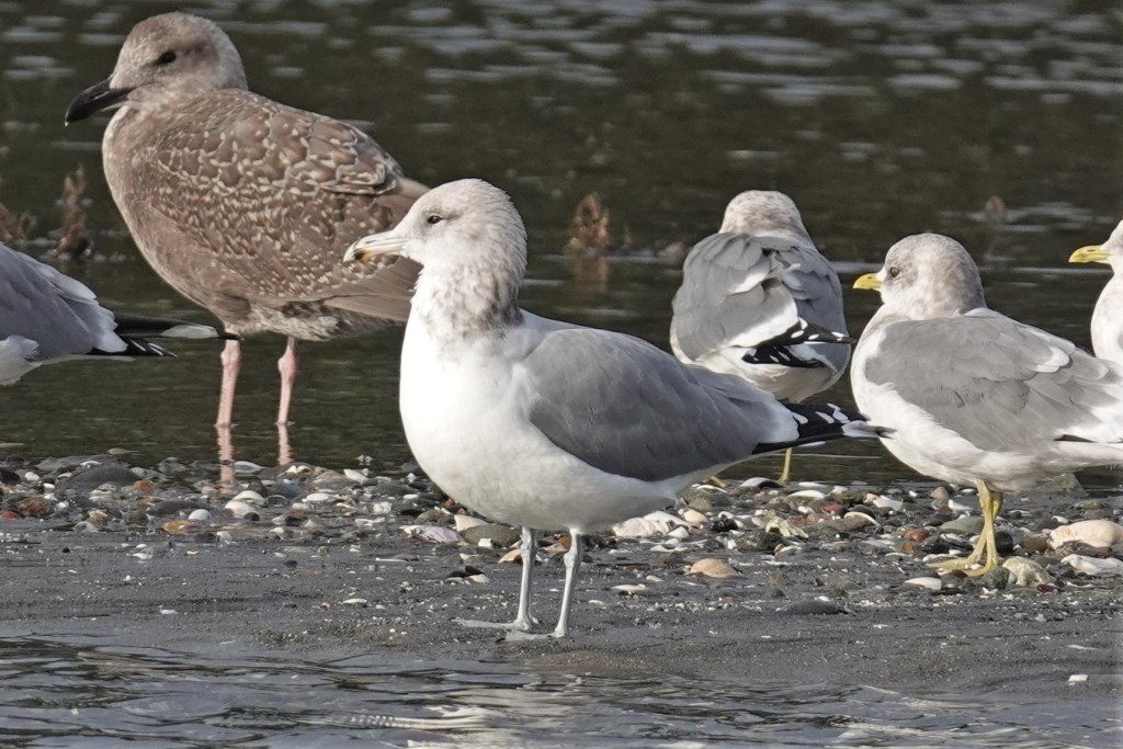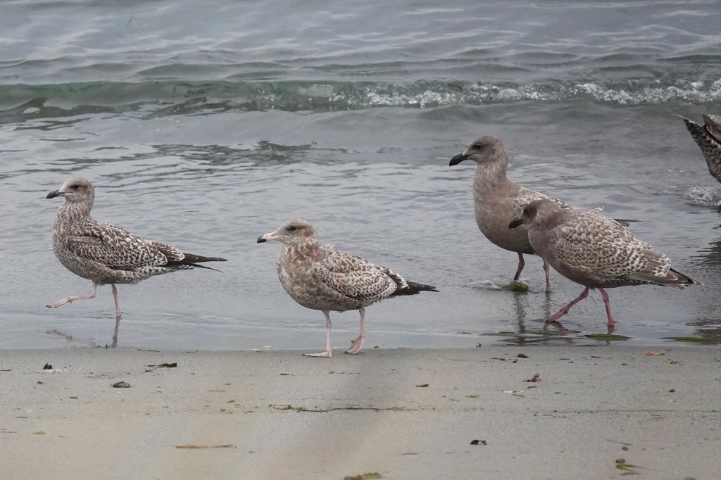 Sept 22 – From left to right: Heermann’s, Thayer’s, California, and Olympic. On the Thayer’s, note the dark eye, bright pink legs, and primary pattern with the pale underside of the far primary. This is actually P9 we are looking at. P10 is missing due to molt.