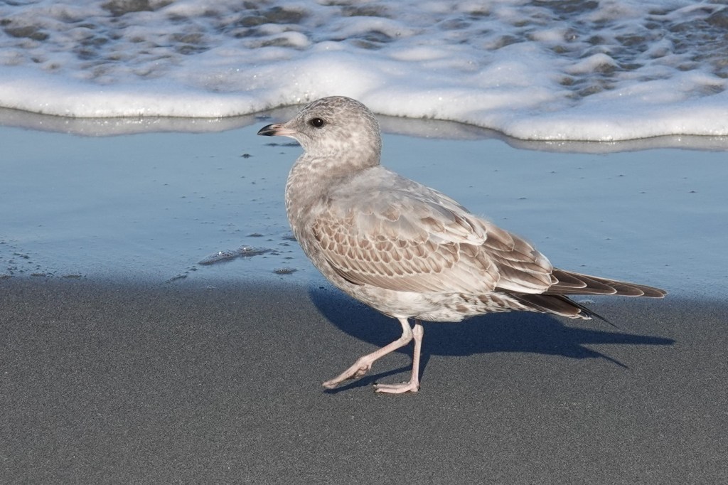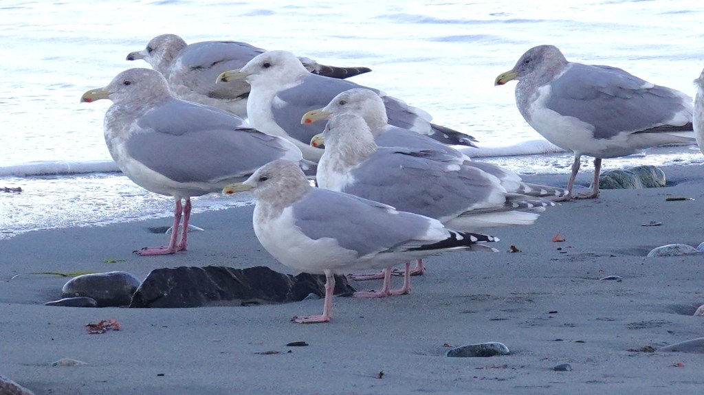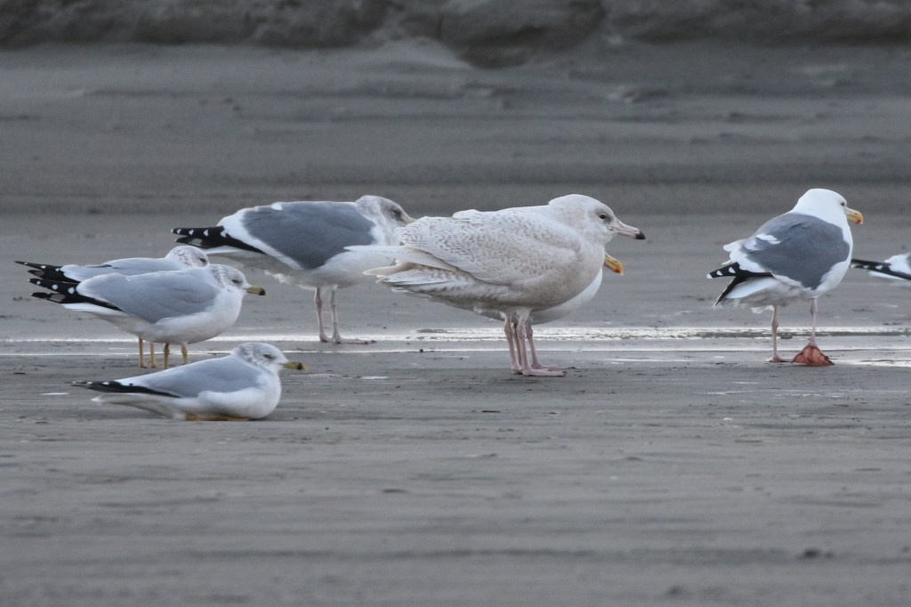 Nov 9 – Most Glaucous Gulls in Washington are 1st cycle birds, like this one. I took this on the beach at Ocean Park. It is accompanied by adult Ring-billed and Western Gulls. The bill is always pink with a well-demarcated black tip. Glaucous-winged never approaches this at any age. Note the bill is also straight and not blob-ended.