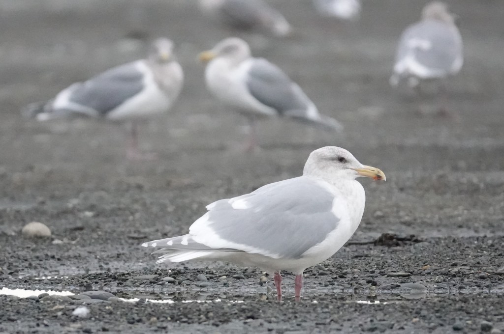 Nov 6 – This bird shows no auricular patch. The primaries are almost patterned as in Glaucous and Iceland. Note the bill, while heavy, is less blob-ended than Western or Olympic, with a shallower gonydeal angle. The tomium (upper edge) often begins a gentle curve about 2/3 of the way out, rather than a strong hook ¾ of the way out, as is typical in Western and Olympic.