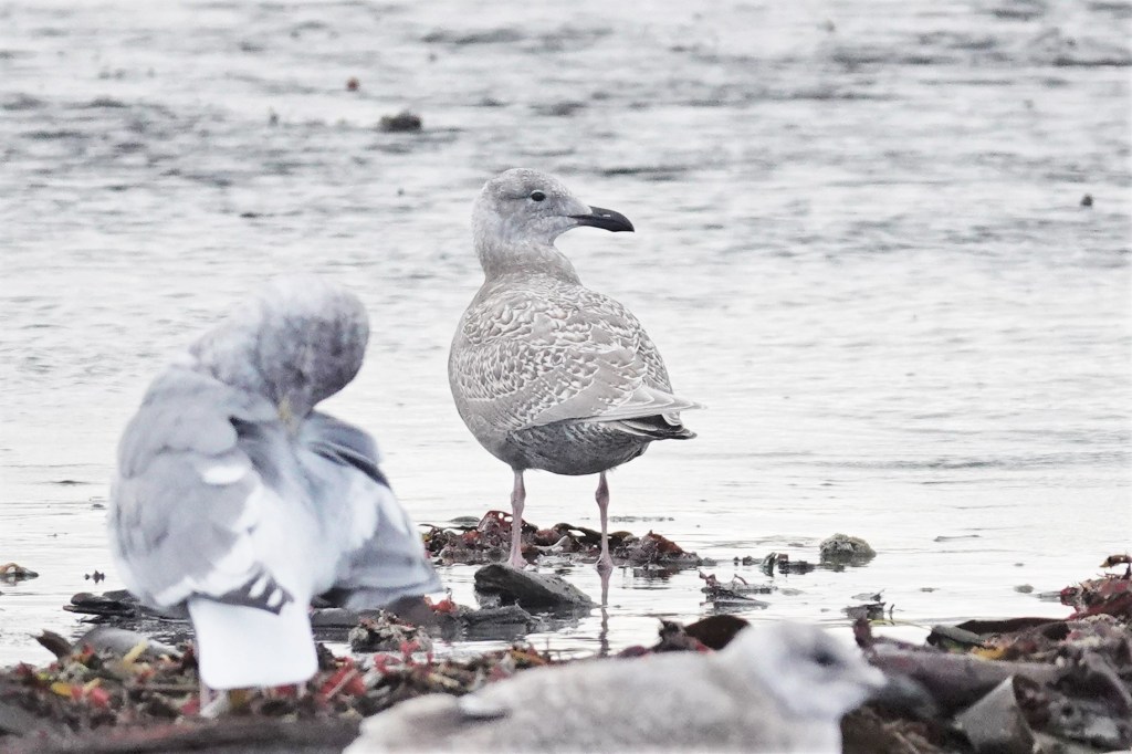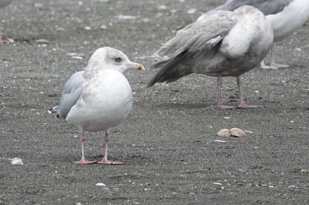 Nov 6 – This one is easy to separate from Olympic – it has a pale version of the Herring Gull bill, pale with a black tip. The dark gray primaries rule out black-primaried gulls and imply either a Thayer’s or Gl-W hybrid. The molted scapulars, structure, and gray color tones rule out Thayer’s. Olympic in the background.