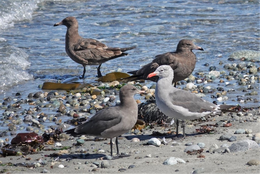Aug 15 – This is a four-year gull. This photo features two brown juveniles in the back (molting their scapulars), a 2nd cycle front left, and an adult front right. Heermann’s Gulls have black legs at all ages.