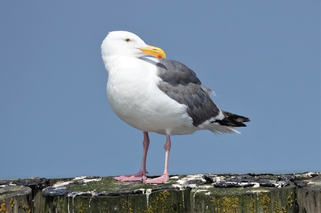 July 27 – This summer adult is a classic Western: a clean white head (which they keep year round), a thick bulbous school bus yellow bill, a darkish mantle, and jet black in the primaries. Note also the yellow orbital ring. The eye varies from yellow to dark.