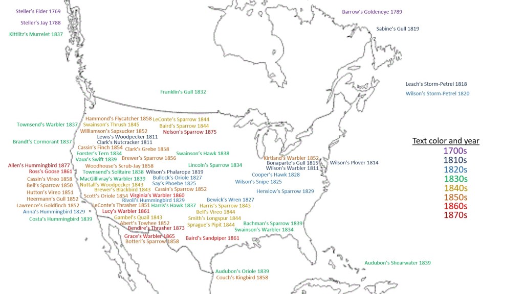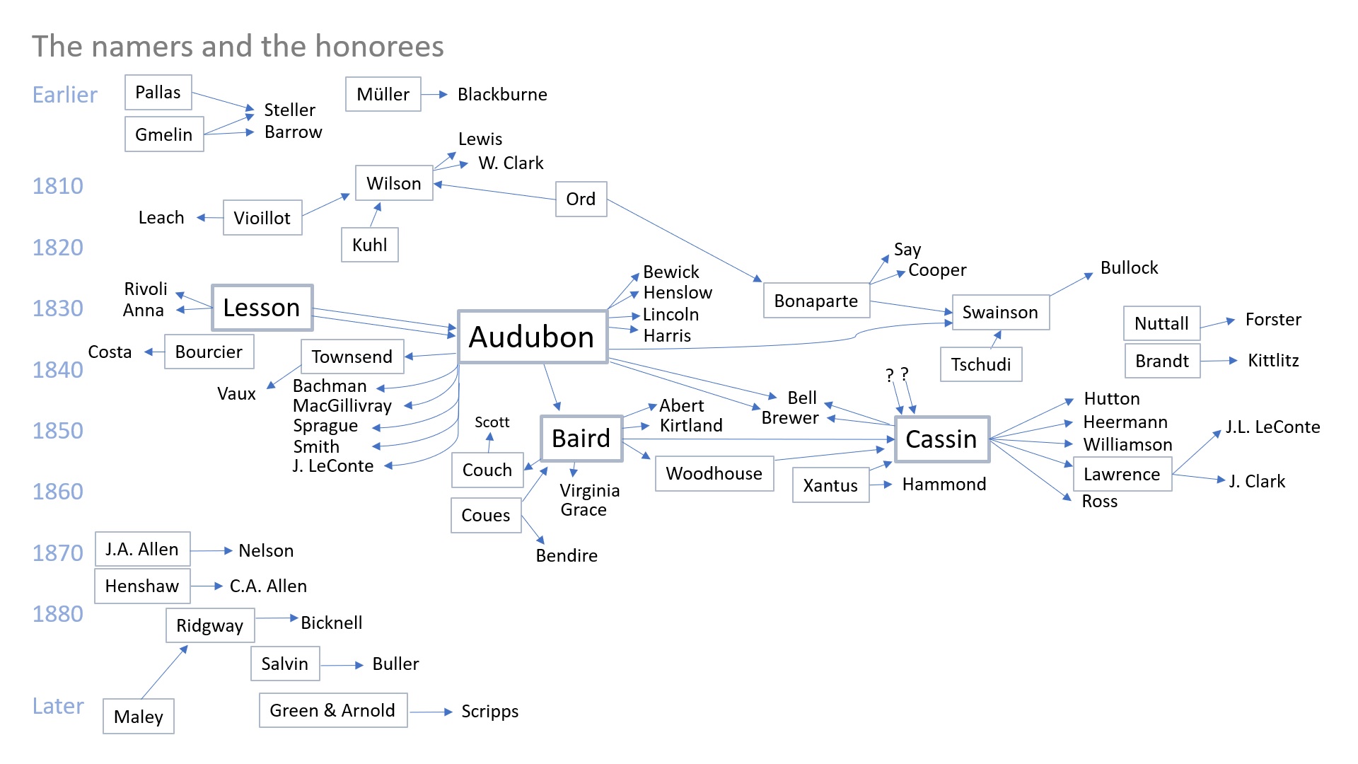 The namers were widespread – 36 different people provided the 80 names, though four stand out. John James Audubon provided fifteen of the eponymous names, Spencer Baird and John Cassin each provided seven, and Rene Lesson four. Together, these four ornithologists were responsible for 41% (33/80) of the honorific names in this analysis. In addition, many eponymous subspecies were coined by Baird.