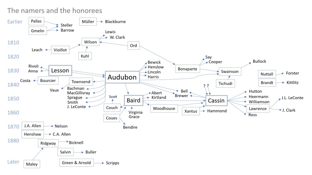 Despite Audubon’s dominant role in honorific naming, no Americans honored him (excepting Townsend with Audubon’s Warbler); only Lesson, a Frenchman, did.