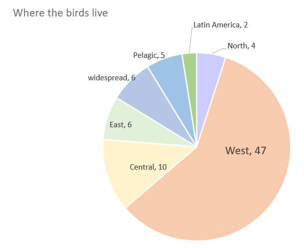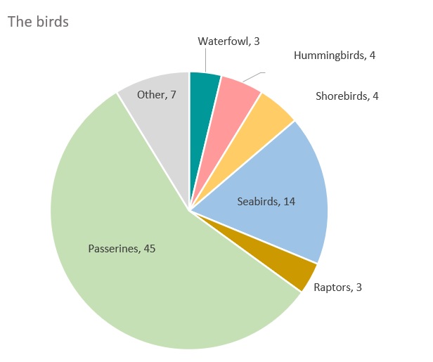 The first thing to note is that these 80 species come from a wide array of families and species groupings. As with all birds, Passerines are dominant, making up 49% of the list. Digging deeper, seabirds and Passerines with limited ranges (mostly warblers and sparrows) are over-represented—because they were described relatively late in the European discovery process, when honorific naming became more in vogue.