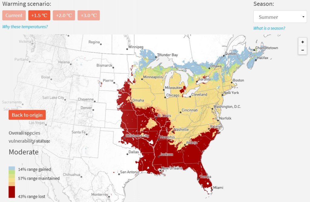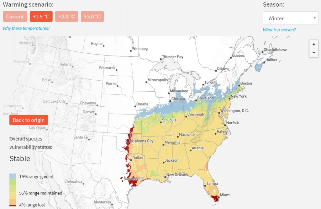 They are a prime example of a species that is considered “Least Concern” by the International Union for Conservation of Nature (IUCN), but “High Risk” in National Audubon’s assessment of birds under climate change. In their 3.0 C scenario, they predict it would lose 83% of its current breeding range, while gaining only 23%.