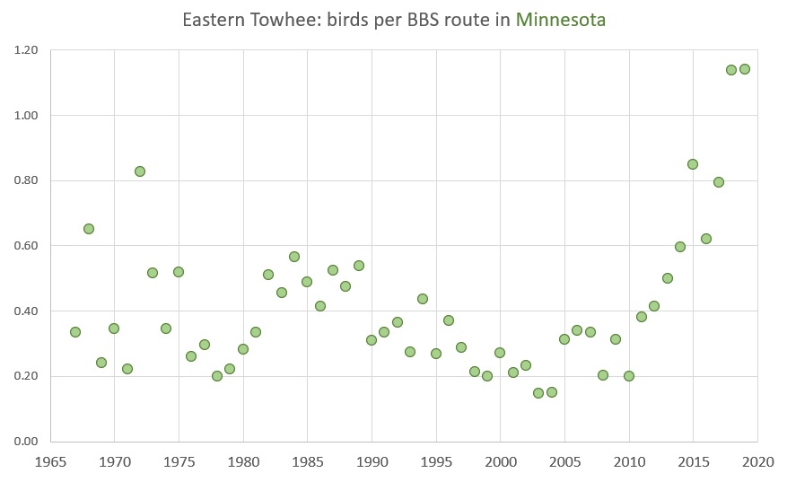 As the climate warms, many species are expanding north and/or declining in the southern part of their range. But these need not happen simultaneously. Opportunities for suitable habitat may open doors in the north, and doors may close in the south, at different times. There is evidence of Eastern Towhee expansion in Minnesota, but look at the vertical axis; it does not compare with the losses in Florida.
