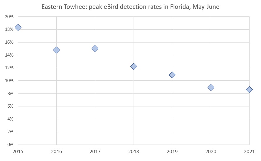 Based on Breeding Bird Survey (BBS) data, the Eastern Towhee breeding population in Florida has declined over 50% since the late 1990s. The timing of this is consistent with worldwide ecological shifts which began in the mid-1980s.