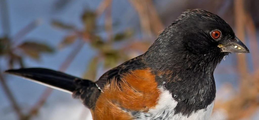 The Eastern Towhee, a bird of scrub and thickets, is a common resident in the southeast United States. One subspecies migrates north in summer.