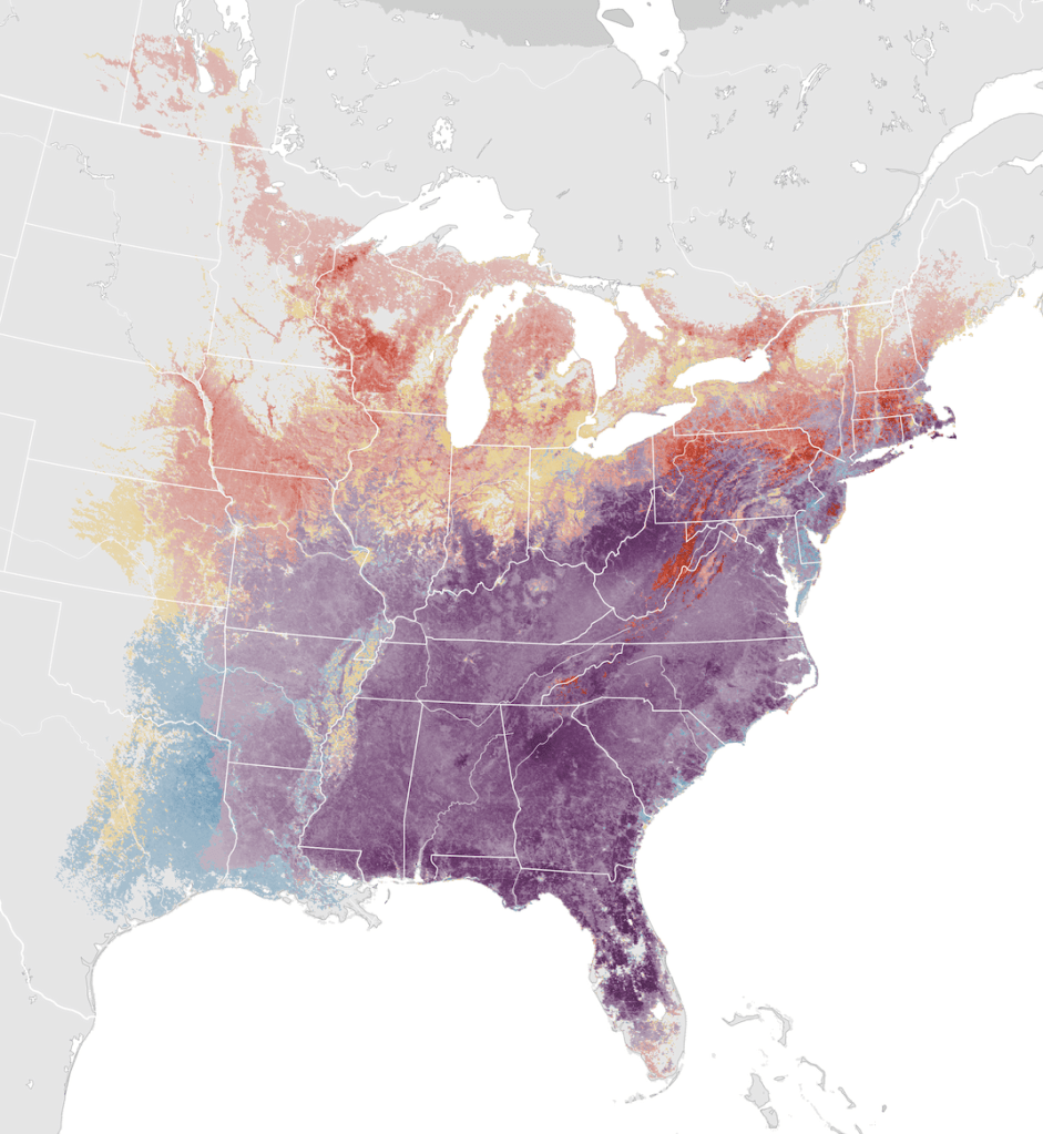 These projections are consistent with recent literature showing poleward shifts of species ranges– of the northern edge of their range, of the southern edge, and of their range’s geographic center. The predictions for Eastern Towhee are among the most dramatic.