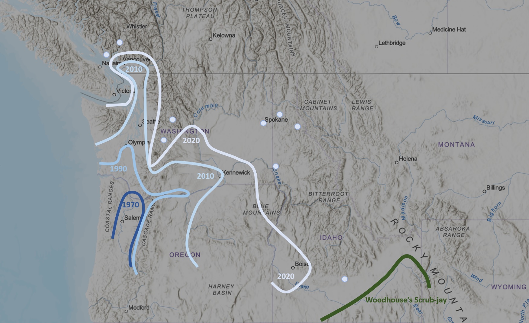 As becomes clear in the article, these are not hard lines. The jays are advancing gradually, not in a solid wave. Typically, a single jay will appear well outside the known range (e.g. Spokane). Within a year or two, there will be several. Then they’ll be breeding. Then they will begin expanding further. Meanwhile, a wave of jays will be backfilling the new territory, with densities increasing annually. The lines in this map are as much art as science, but are intended to show the primary region were jays were “regular and expected”. There were always outliers, pioneer dispersers expanding the range. Records beyond the 2020 line are shown as pale blue dots.